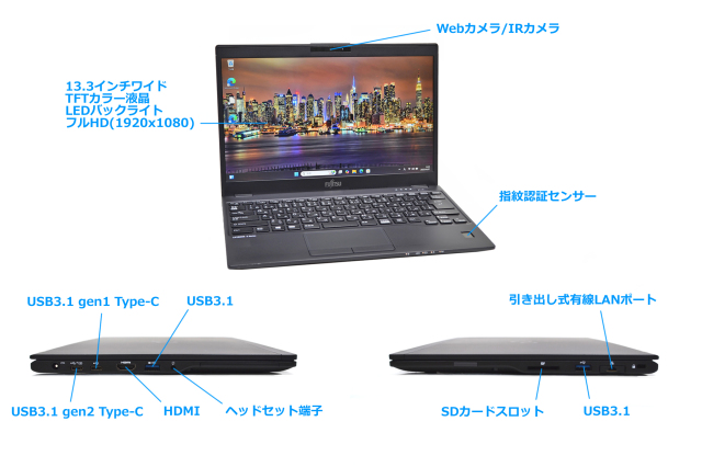 | USBポート | Type-C USB3.1 (Gen2) Type-C (Display Port Altermate Mode対応)×1 (左側面奥)、USB3.1 (Gen1) Type-C ×1 (左側面手前) Type-A USB3.1 (Gen1)準拠×2 (右側面×1、左側面×1、左側面は電源オフUSB充電機能付き) |